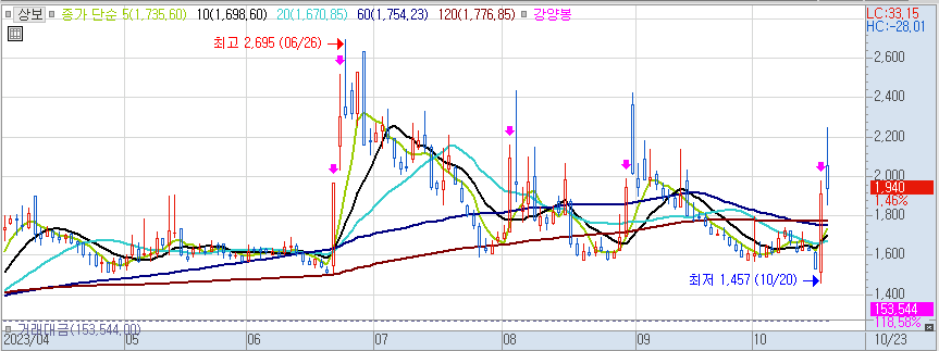 차트 분석 : 많이 움직여봐야 5% 내외로 움직이던 차트가 2023년 4월 2차전지 이슈를 기점으로 급등하거나 상한가가 나타나는 차트로 변했습니다.