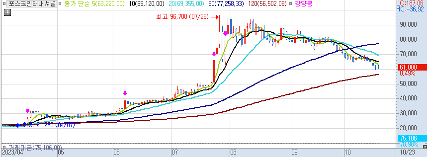 가장 이슈가 되는 종목은 '크리스탈신소재'로 보인다. 대부분의 종목이 2차 전지 이슈 이후에 주가가 많이 빠진 상태로 볼 수 있겠다. 현재는 직전 고점을 뚫는 모습이 나와야 매매를 할 수 있겠지만 포스코퓨처엠, 포스코인터내셔널은 시총이 10조이상의 종목으로 대형주이기 때문에 재무재표는 안정적인 모습이다.