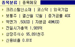 재무제표 : 부채비율이 낮은 편이다. 외국기업으로 코스닥에 상장되어 있다.
